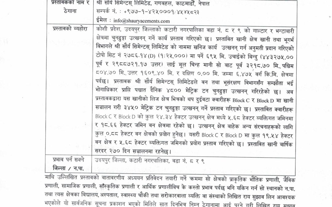 उदयपुर जिल्लाको कतारी नगरपालिका क्षेत्रमा चुनढुंगा उत्खनन