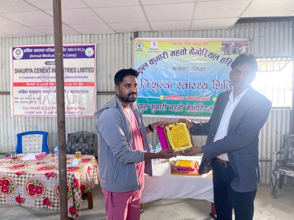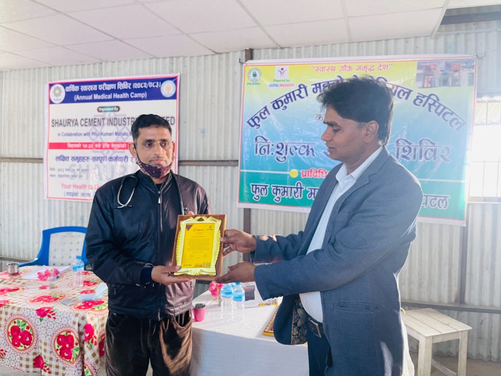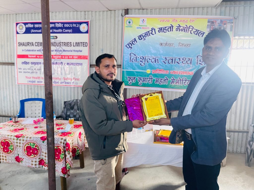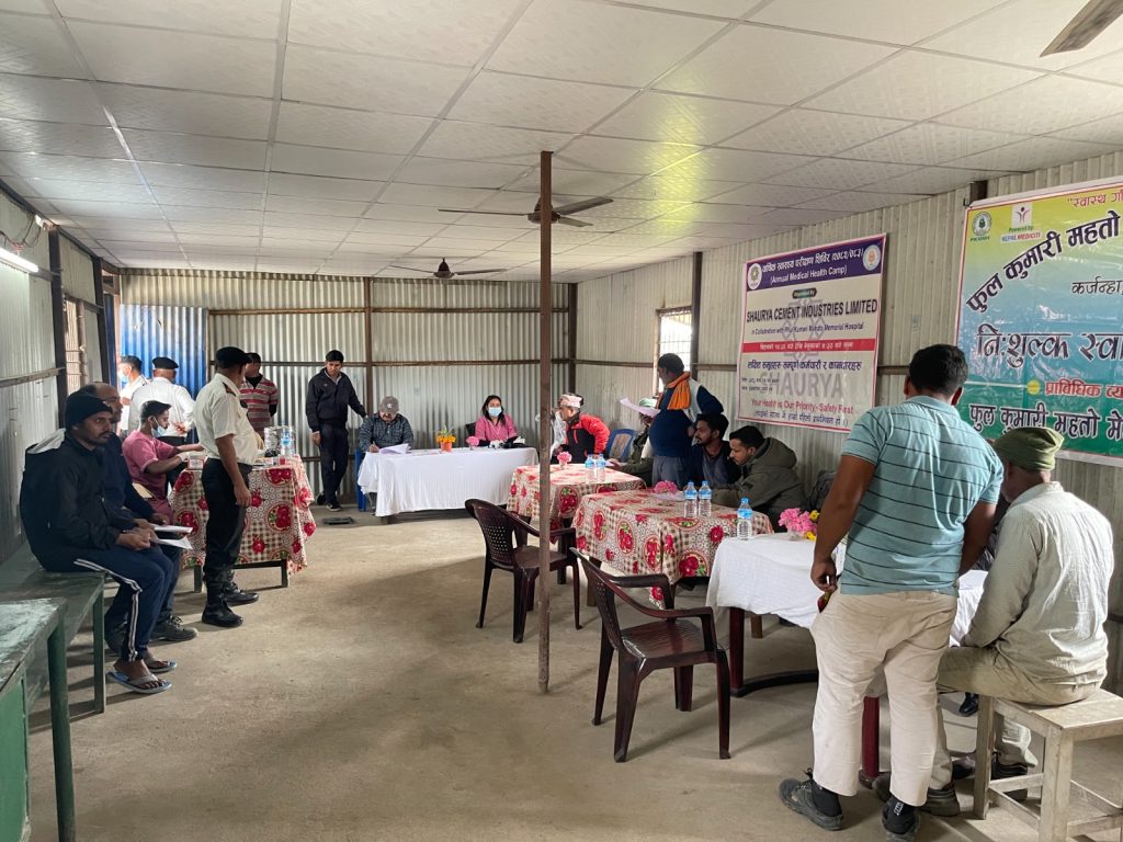 शौर्य सिमेन्ट इण्डष्ट्रिज लिमिटेडले आफ्ना सम्पूर्ण कर्मचारी तथा श्रमिकहरूको स्वास्थ्य र कल्याणलाई उच्च प्राथमिकतामा राख्दै सिराहा जिल्लाको मिर्चैयास्थित कारखानामा वार्षिक स्वास्थ्य परीक्षण शिविर सफलतापूर्वक सम्पन्न गरेको छ। उक्त स्वास्थ्य शिविर फूलकुमारी महतो मेमोरियल अस्पतालको सहकार्यमा सञ्चालन गरिएको हो।